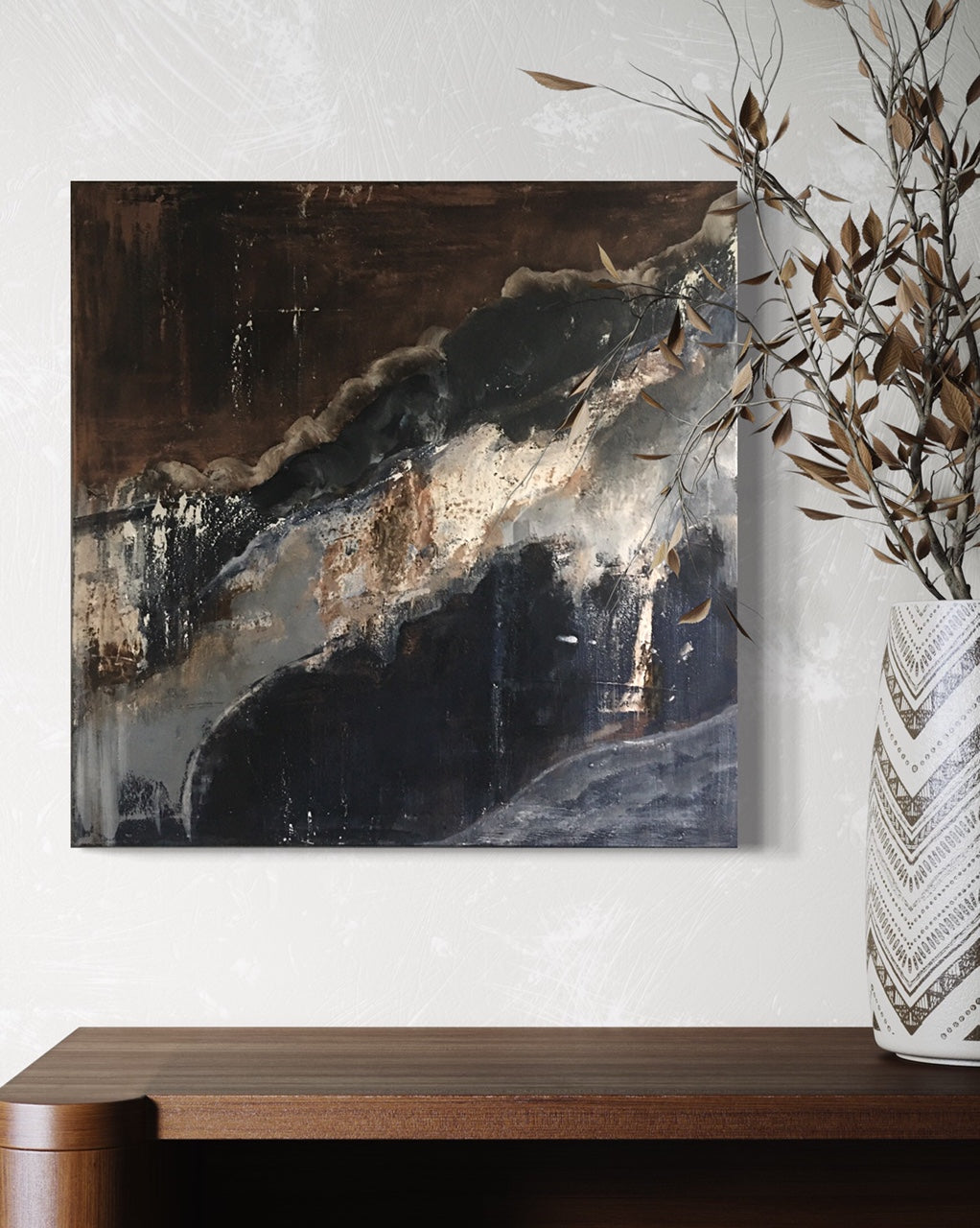 A captivating exploration of geological layers unfolding like a natural symphony. Acrylic on canvas