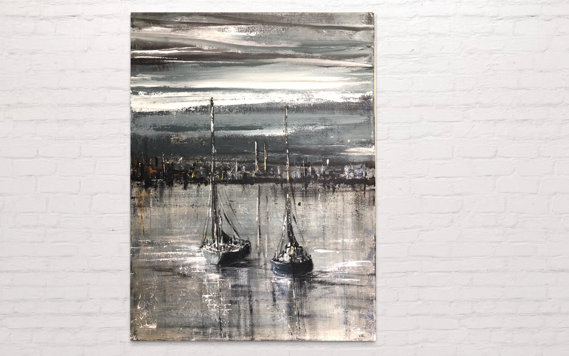 The ethereal stillness of evening descends as sailboats float under a softly painted sky, capturing a moment of peace.Acrylic on canvas