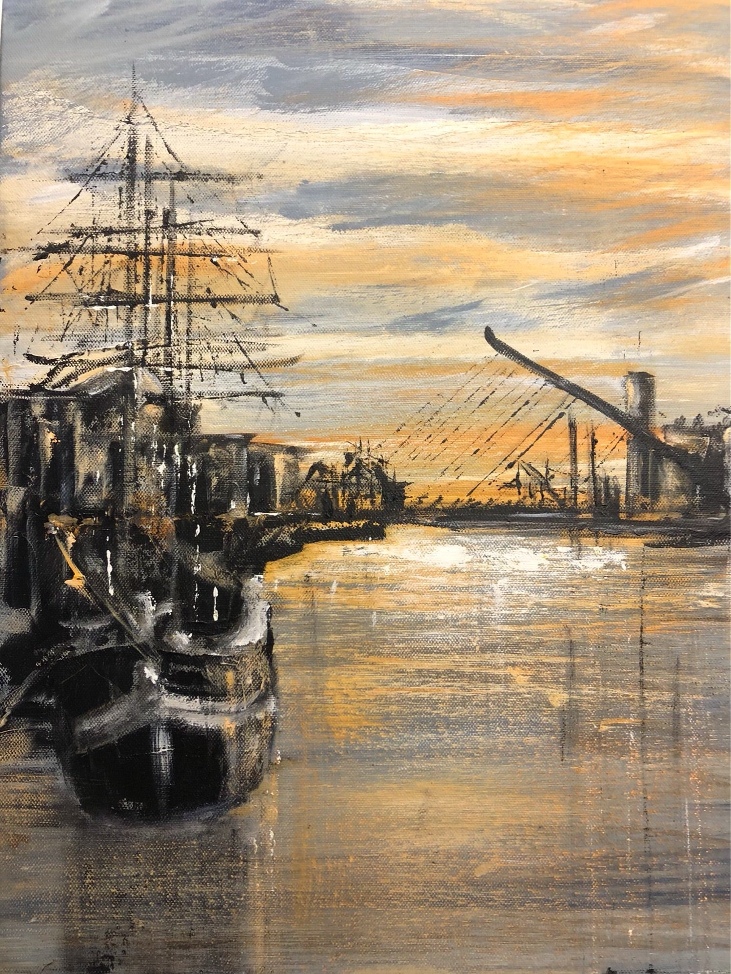 A serene Jeanie Johnston rests in the tranquil Dublin harbor , with the bridge in the background as the sun dips below the horizon, painting the sky in warm hues. Acrylic on Canvas