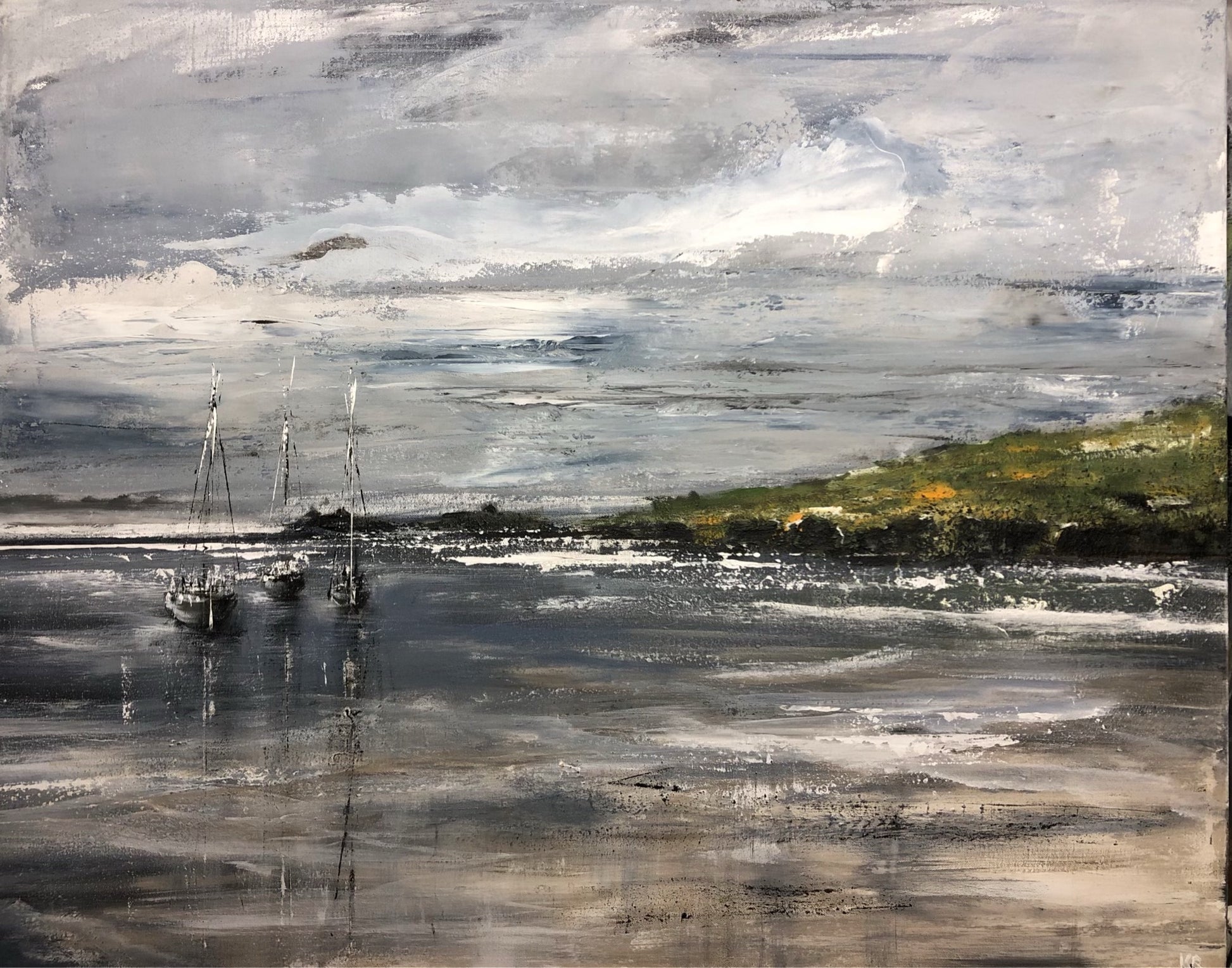 A serene landscape with muted tones invites contemplation as boats rest under an overcast sky. Acrylic on canvas